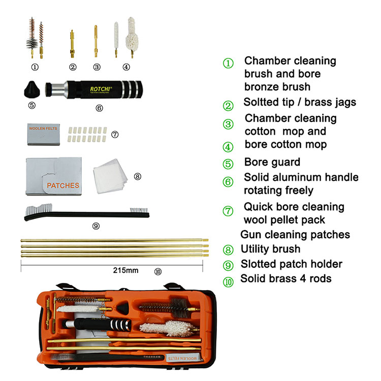 Trealamh Glanadh Gunna- Trealamh Raidhfil(.22,.25,.27,.30,.338) Soláthraíonn na feisteáin ghlantacháin dhlúth-ghunna na huirlisí glanta gairmiúla iomlána duit chun freastal ar chaighdeán gunna éagsúla. Cuidíonn tráidirí blister leat iad a bhailiú go rialta.