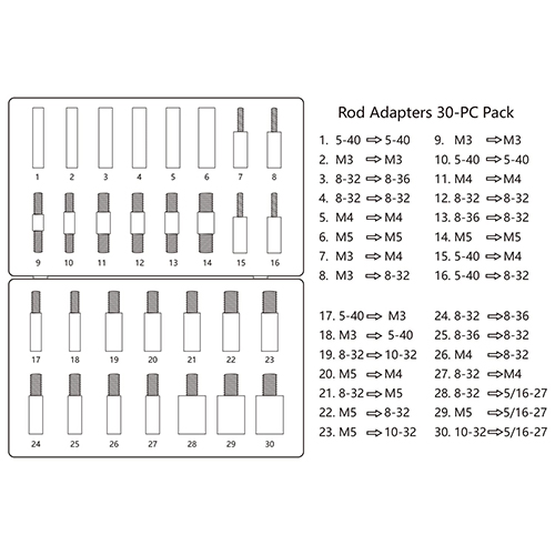 Cuibheoirí Feistiú Slat Glanadh Gunna 30 Pcs Pacáiste 5-40 8-32 10-32 5/16-27 Snáitheanna M3 M4 M5 i gCeanglóir Slat Fir agus Mná