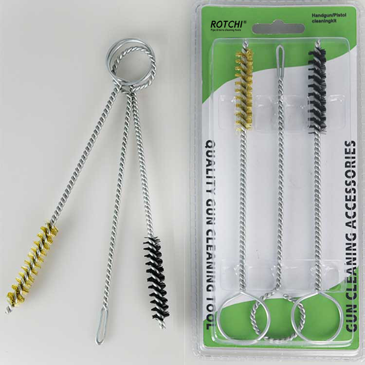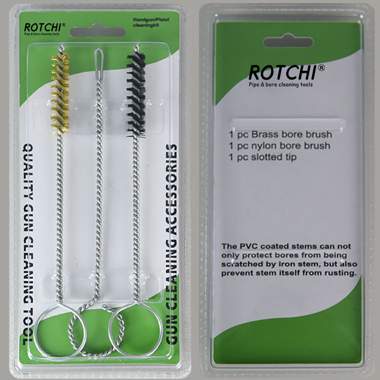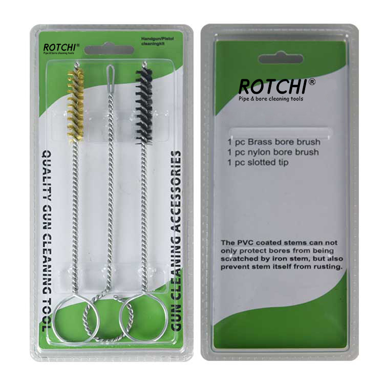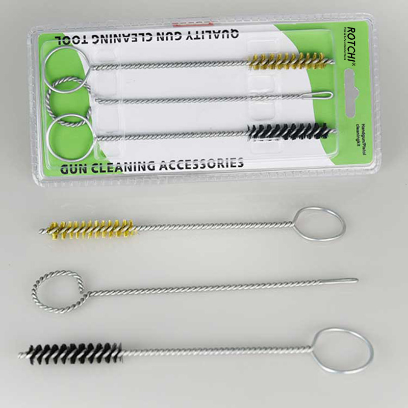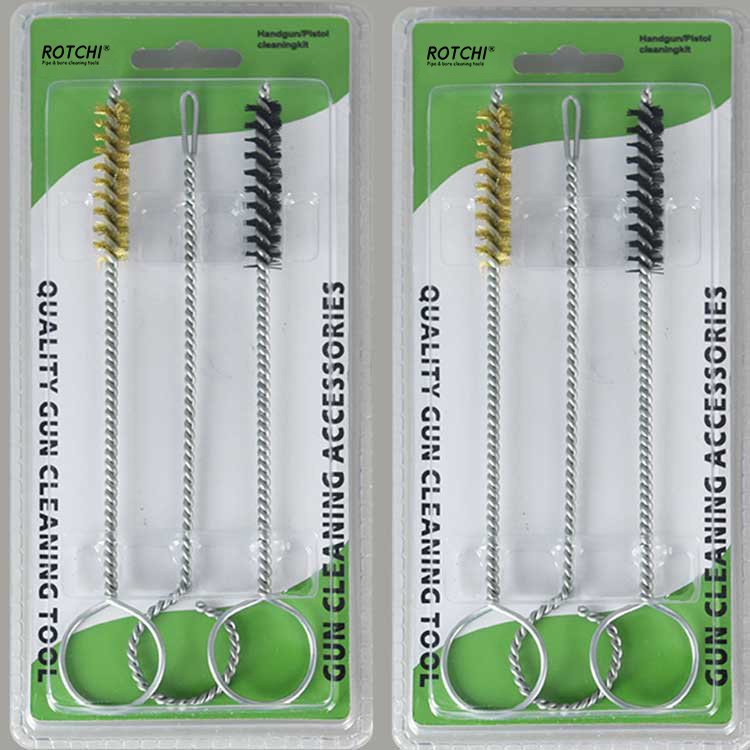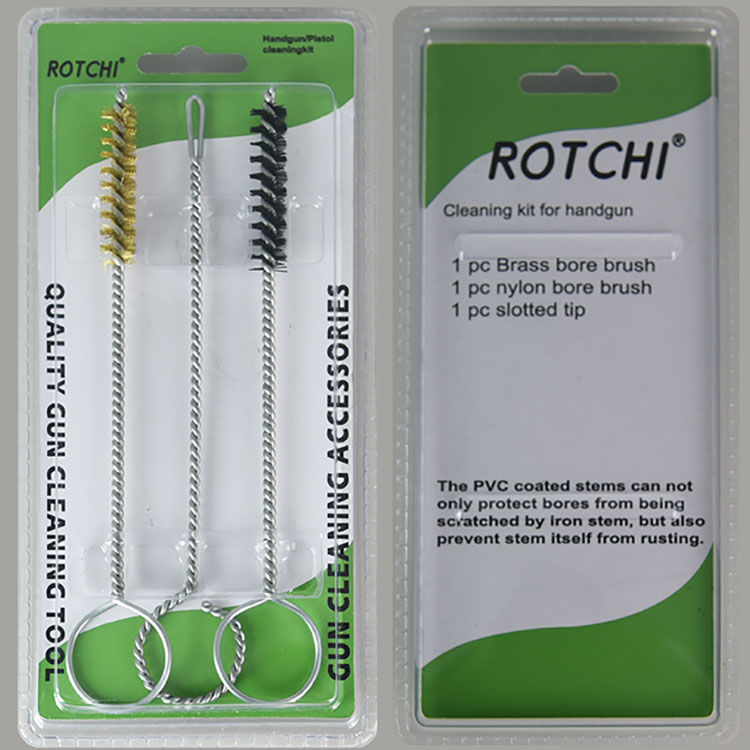 Pacáiste Blister Kit Glanta gunna láimhe 9mm 3 ríomhaire seithandgun trealamh glantacháin, pacáilte i blister dúbailte. Scuab glantacháin tollta práis amháin, scuab glantacháin thonn níolón amháin agus sealbhóir paiste sliotán amháin. Handy agus éifeachtach.