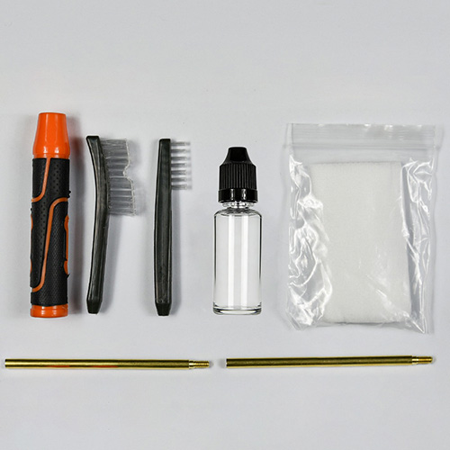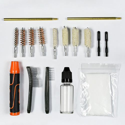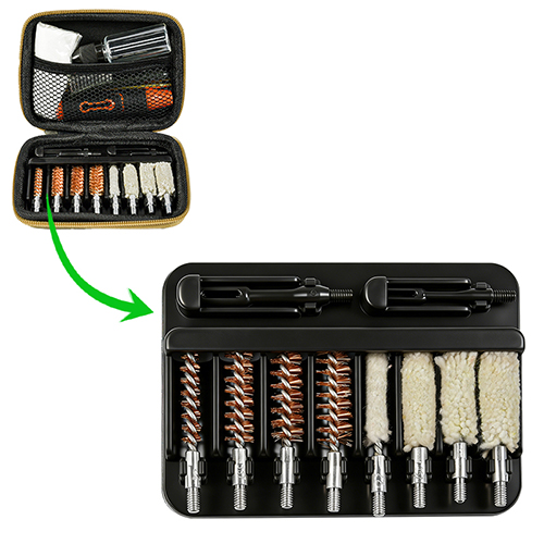 Áirítear ar threalamh glantacháin gunna láimhe 4 mhéid (.22, 9mm, .40, .45cal.). OX éadach brataithe Cás PVC le zip . Scuaba práis agus mapaí cadáis, 2 shlat. Gaineamh agus dubh dath le haghaidh roghanna.