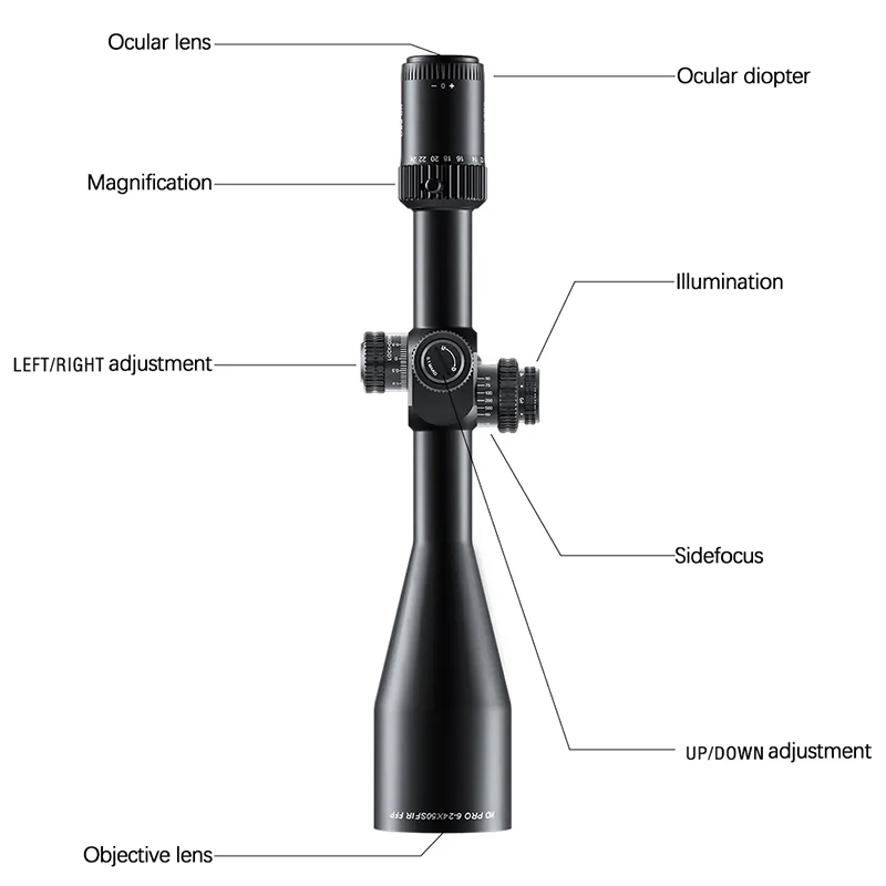 6-24x50 Scóip Raidhfil Inchoigeartaithe Reticle Red Green Ponc Fiach Scóipeanna Raidhfilscóip Oirbheartaíochta Raidhfilscóip Fiaigh Radharc Raon feidhme