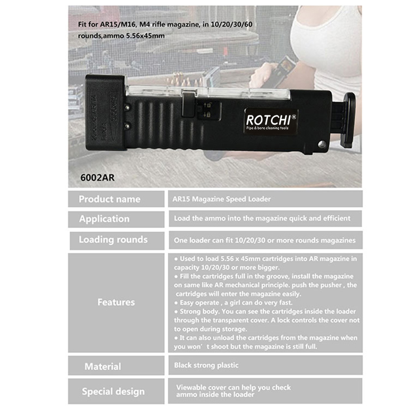 Tá lódóir luais Gun Magazine le haghaidh cartúis 5.56x45mm déanta as comhlacht plaisteach athneartaithe, a úsáidtear go forleathan chun cartúis a luchtú go hacmhainn iris AR 10-30