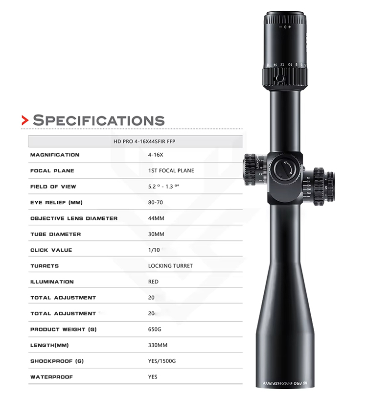 Optics HD PRO 4-16X44 SFIR FFP Frithsheasmhacht Ard Turraing Fiach Raon Feidhme Lámhach Fadraoin Oirbheartaíochta Feadán 30mm